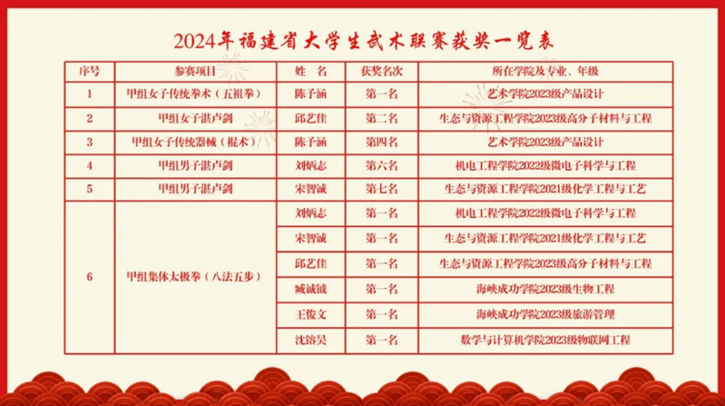 我院23级物联网工程1班的沈镕昊同学参与此次比赛普通本科高校组“集体太极拳(八法五步)”项目。依靠坚持不懈的毅力以及良好的团队协作能力,沈镕昊同学所在的太极拳团队最终取得了福建省大学生武术联赛普通本科高校组“集体太极拳(八法五步)”项目的第一名,荣得桂冠。