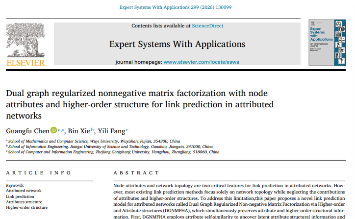 研究成果以“Dual graph regularized nonnegative matrix factorization with node attributes and higher-order structure for link prediction in attributed networks”为题,发表于国际人工智能权威期刊《Expert Systems With Applications》/(中科院一区Top,IF=7.5)。陈广福为第一和通讯作者,江西理工大学谢斌博士和浙江工商大学方毅立博士为共同作者,武夷学院为第一完成单位。