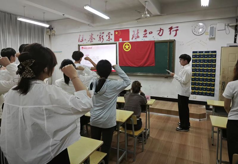 在宣誓环节,由优秀团员代表领誓,新团员面向团旗,高举右拳,庄严宣誓。铿锵的誓言传递出他们坚定的信念和青春的担当。