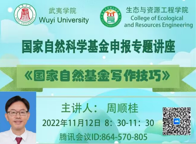 为做好2023年度国家自然科学基金项目申请工作,进一步提升申报质量、提高资助率,2022年11月12日,武夷学院生态与资源工程学院举办2023年度国家自然科学基金申报专题讲座,特邀国家杰出青年科学基金获得者、福建农林大学周顺桂教授作《国家自然基金写作技巧》培训讲座。武夷学院百余名教师参加了此次线上培训讲座。