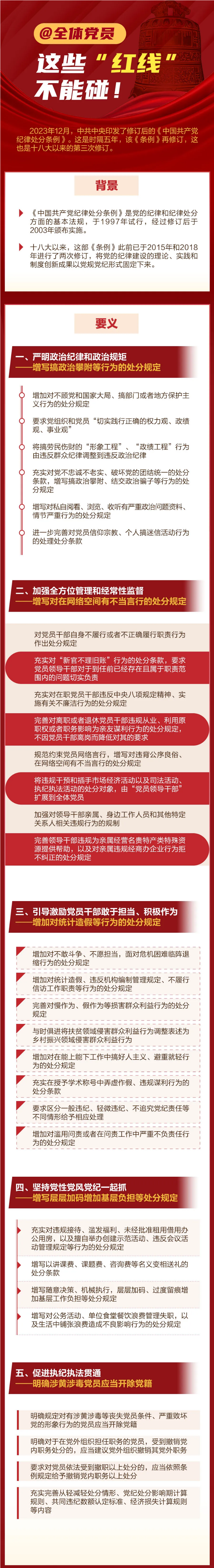 2023年12月,中共中央印发《中国共产党纪律处分条例》。这是《中国共产党纪律处分条例》时隔五年再修订,这也是党的十八大以来该条例的第三次修订。
