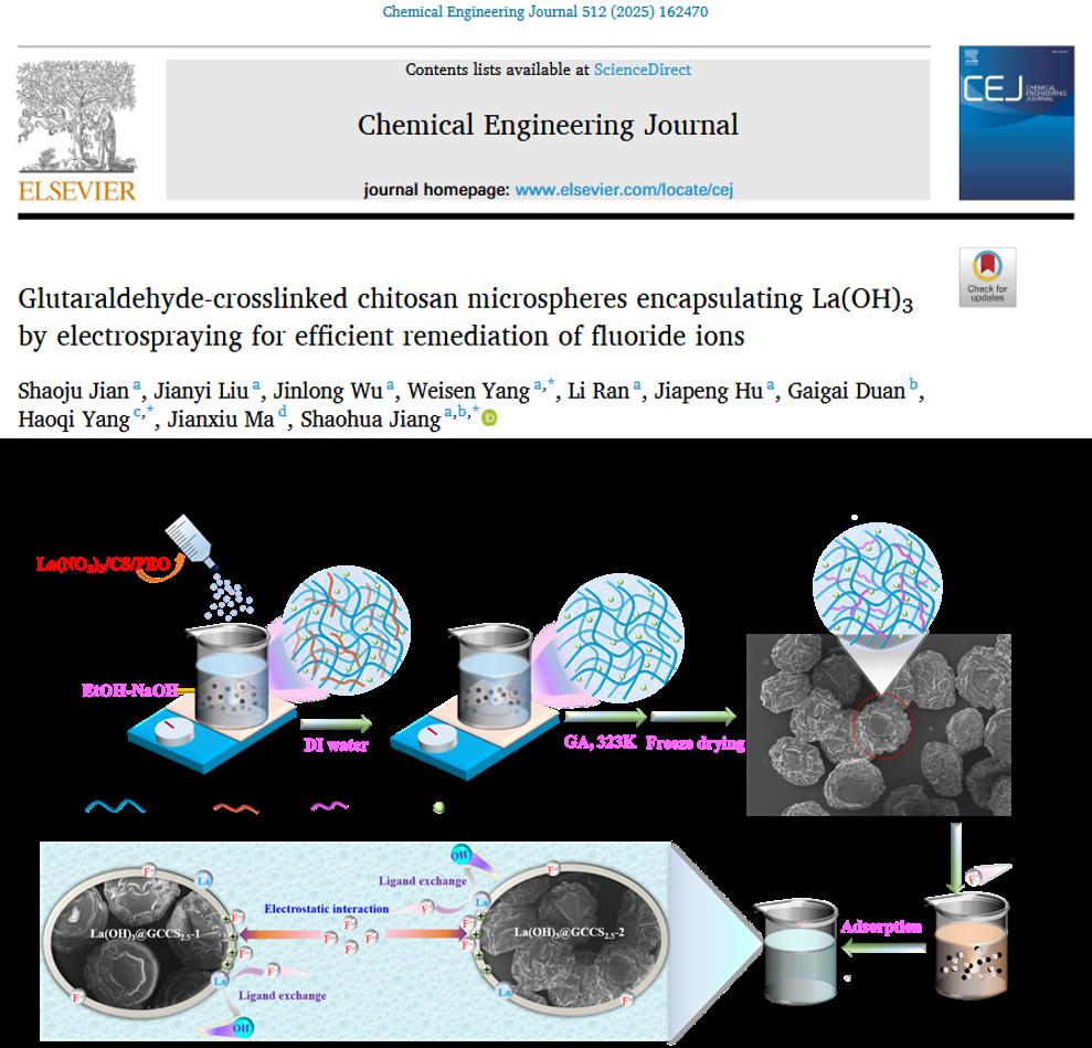 本研究团队联合南京林业大学和扬州大学科研团队,采用静电喷雾技术设计制备出两种壳聚糖基微球(La(OH)3@GCCSx-1和La(OH)3@GCCSx-2),作为高效除氟剂。全面评估了上述两种微球的除氟性能、选择性、循环使用性能及除氟机理。