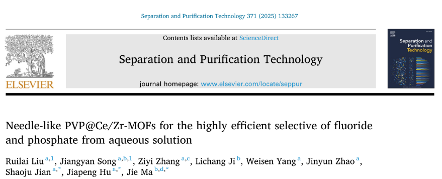 近日,该两项研究成果分别以 “Needle-like PVP@Ce/Zr-MOFs for the highly efficient selective removal of fluoride and phosphate from aqueous solution” 为题,发表于国际著名期刊 《Separation and Purification Technology》(中科院工程技术二区TOP期刊,IF=9.7),刘瑞来博士为论文第一作者,胡家朋教授、简绍菊副教授和同济大学马杰教授为文章共同通讯作者。以《Glutaraldehyde-crosslinked chitosan microspheres encapsulating La(OH)3 by electrospraying for efficient remediation of fluoride ions》为题,发表于Chemical Engineering Journal(中国科学院一区TOP,IF=13.2)。简绍菊博士为第一作者,杨为森教授、南京林业大学蒋少华教授和扬州大学杨皓奇教授为文章共同通讯作者。该两项研究成果均以武夷学院为第一完成单位。
