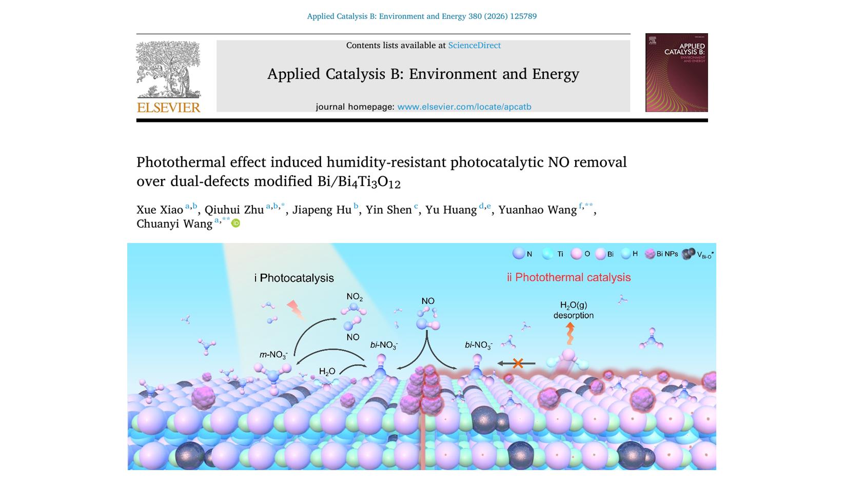 痕量氮氧化物(NOx)是导致空气中PM2.5和O3形成的典型前驱物之一。光催化脱硝技术已被证明在NOx控制中有潜在应用前景。但是在光催化转化痕量NOx的应用探索过程中,其活性常因空气中无处不在的水分子而降低。如何解决这一问题并阐明其分子层面的潜在机制,已成为光催化转化痕量NOx的关键科学问题。基于此,本团队研究制备出Bi-O双缺陷修饰的全光谱响应材料,通过Bi和双缺陷协同产生的光热效应促进H2O解吸附进而抑制H2O与稳定的二齿硝酸盐(bi-NO3⁻)通过氢键相互作用生成单齿硝酸盐(m-NO3⁻),从而阻碍m-NO3⁻向NO/NO2的光分解,进而展现出湿度非依赖的光催化活性。研究成果以《Photothermal effect induced humidity-resistant photocatalytic NO removal over dual-defects modified Bi/Bi4Ti3O12》为题,发表于环境科学期刊Applied Catalysis B: Environment and Energy /(中国科学院一区TOP,IF=21.1)。我校联合培养硕士研究生肖雪为第一作者,祝秋会博士为第一通讯作者,北京科技大学汪远昊教授和陕西科技大学王传义教授为共同通讯作者。