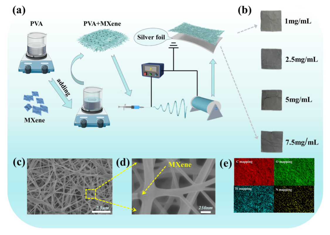 针对传统摩擦纳米发电机(TENG)存在的穿戴不便、透气性差、识别准确率有限等问题,本团队联合中国科学院半导体研究所、福建工程学院和闽江学院等科研机构,提出了一种新型柔性能源材料体系。研究团队通过静电纺丝方法,将高介电常数的氮掺杂 MXene(Ti₃CNTₓ)纳米片引入聚乙烯醇(PVA)基体,制备出超薄透气的 MXene/PVA 纳米纤维膜,并构建了高性能摩擦纳米发电机(MP-TENG)。该材料在保持优异柔性的同时,展现出高介电常数和电荷转移能力,其输出功率密度可达 5.5 W/m²,在 10000 次连续循环测试后仍保持 96% 输出稳定性。该研究不仅开辟了柔性 MXene 基摩擦纳米发电机在能源收集和自驱动人机交互中的新途径,也为下一代舒适、环保、精准的可穿戴交互系统提供了重要的材料与技术支持。
