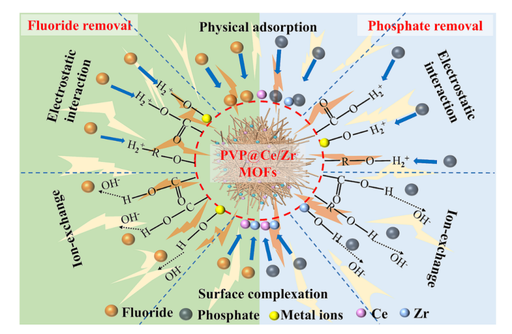 为此,我校生态与资源工程学院环境功能材料开发与应用研究团队,联合同济大学和福州大学科研团队,创新性地引入聚乙烯吡咯烷酮(PVP)分散剂,采用水热法合成了针状 PVP@Ce/Zr-MOFs 吸附剂。该材料在结构设计上实现了稳定分散和择优晶体取向,表现出优异的同步除氟脱磷性能。该材料在 pH 2~10 宽范围内保持高效吸附能力,在实际废水中同样展现出良好的选择性与稳定性。其最大吸附容量分别达到 169.49 mg/g(氟离子)和 140.85 mg/g(磷酸盐),明显优于常见吸附剂。机理分析进一步揭示了其通过电荷相互作用、配位交换和表面络合等多重机制实现对氟和磷的高效去除。同时,该团队开展了实际废水处理与循环再生实验,结果显示该新型材料在多次循环后仍保持较高的除氟能力,并能有效将废水中氟离子与磷酸盐浓度降至饮用水安全标准以下,展现出良好的工程应用前景。