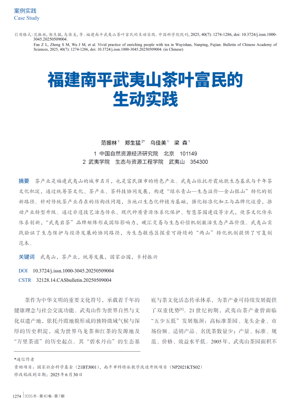 近日,我校生态与资源工程学院郑生猛副教授与中国自然资源经济研究院范振林研究员团队合作完成的研究成果《福建南平武夷山茶叶富民的生动实践》,在《中国科学院院刊》2025年第7期专刊“绿水青山就是金山银山理念20周年回顾与前瞻——科学内涵、战略价值与案例实践”上发表。范振林研究员为第一作者,郑生猛副教授担任通讯作者,武夷学院为第二完成单位。