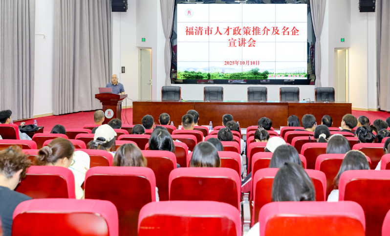 10月10日,福清市引才活动暨2026届机械化学类毕业生秋季专场招聘会在圣农报告厅举行。福清市人力资源和社会保障局携8家重点企业来校开展人才政策推介及引才活动。校党委委员、副校长廖斌出席。