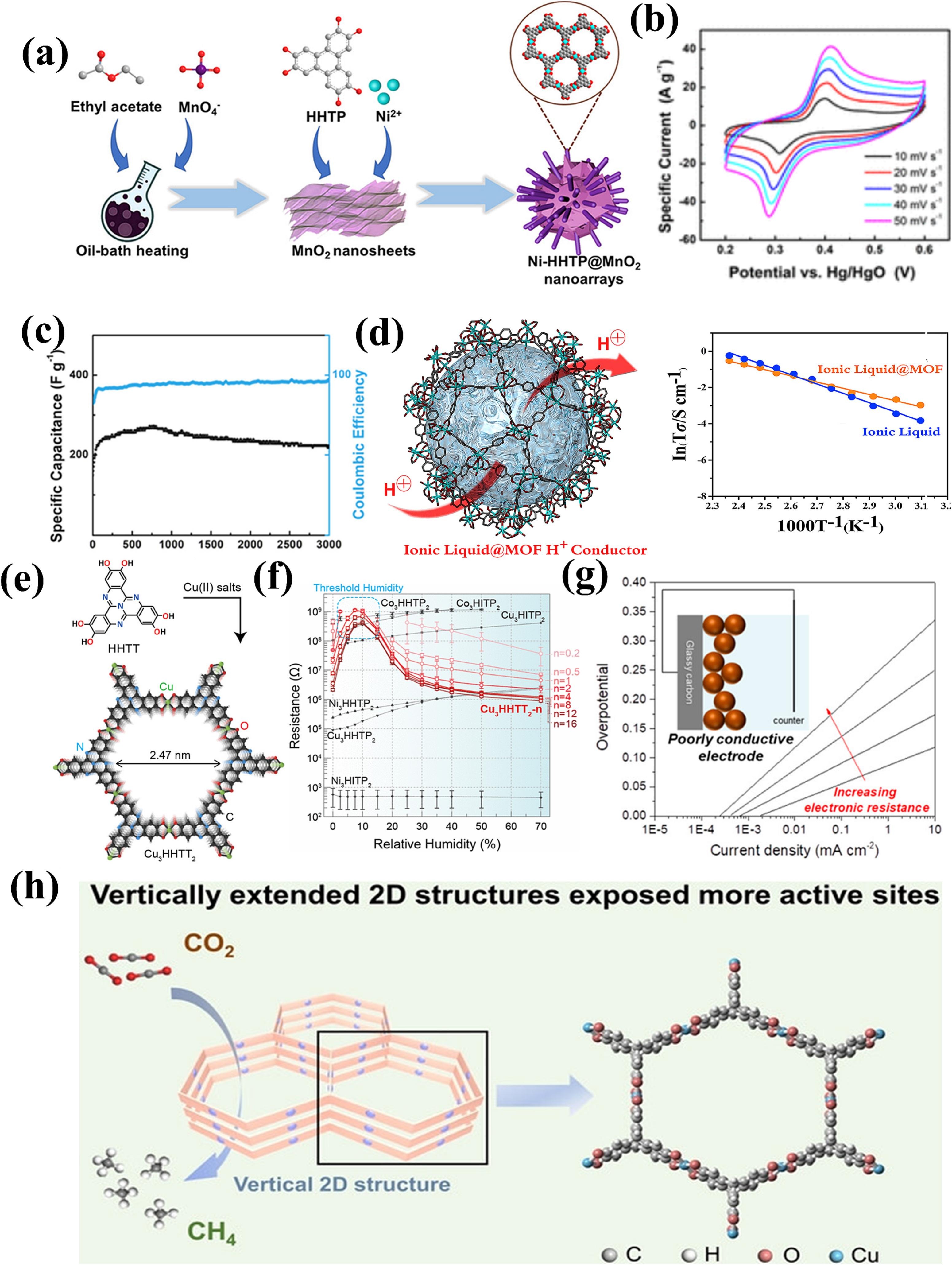 金属有机框架(MOFs)是一类由金属离子/簇与有机配体通过配位键自组装形成的多孔晶态材料,因其具有高比表面积、可调的孔结构和丰富的活性位点,在吸附、催化、传感和能源存储等领域展现出广阔前景。然而,大多数传统MOFs由于金属与配体轨道重叠较弱、缺乏连续的电荷传输路径,导致其导电性差,严重限制了在电化学领域的应用。为突破这一瓶颈,研究者致力于开发导电MOFs(C-MOFs),通过引入π共轭配体、构建金属-配体电荷转移体系、引入导电客体分子等策略,显著提升其电子、质子或离子传导能力,从而拓展其在超级电容器、燃料电池、电催化、传感和电容去离子等电化学装置中的应用潜力。