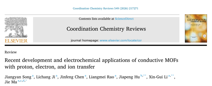 我院胡家朋教授团队多年来持续开展功能性MOF材料的研制与应用研究工作,近期,联合同济大学马杰教授团队,结合近几年该方向的研究进展发表展望性论文,论文以“Recent development and electrochemical applications of conductive MOFs with proton, electron, and ion transfer”为题在线发表于Coordination Chemistry Reviews(中科院一区TOP,IF=23.5)。联合培养硕士研究生宋江燕(现为同济大学博士研究生)为论文第一作者,武夷学院胡家朋教授、同济大学李新贵教授和马杰教授为共同通讯作者。