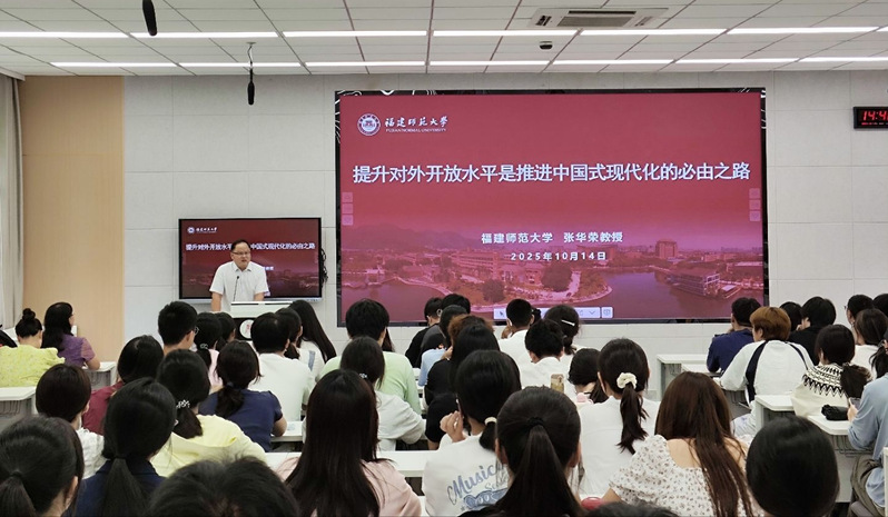 2025年10月14日,福建师范大学张华荣教授应邀到我院,为师生带来一场题为“提升对外开放水平是推进中国式现代化的必由之路”的专题讲座。全院教师及2024级国贸专业全体同学共同参与,讲座由商学院任美英院长主持。