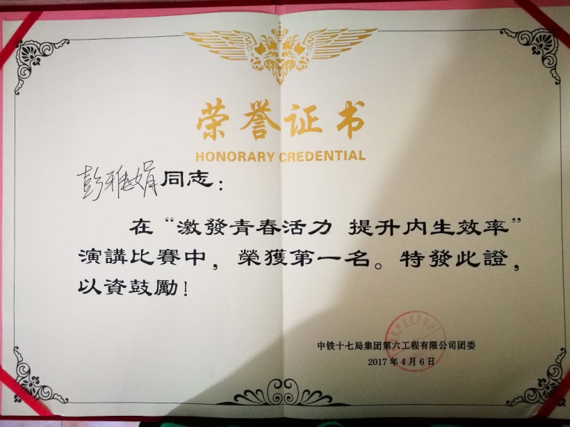 在繁花似锦、草木竞发的阳春三月,中铁十七局第六公司为纪念“五四”运动98周年,大力宣贯集团“三会”精神,隆重举行“激发青春活力,提升内生效率”演讲比赛。我院 2013级土木工程1班彭雅娟同学代表所在的“武夷绕城高速A1标”实习项目组参赛,在20名参赛者中脱颖而出,获得了第一名的好成绩。
