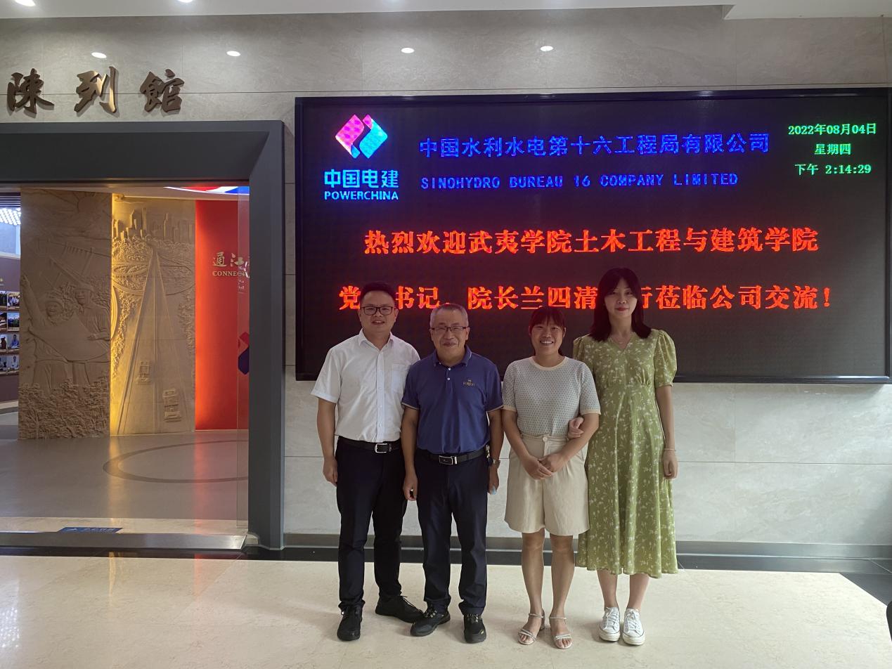为了全力促进2022届毕业生更加充分更高质量就业,2022年8月4日-5日,土木工程与建筑学院党委书记、院长兰四清老师携毕业班辅导员前往中国水利水电十六工程局有限公司、福建华广工程管理有限公司、福建汇信格工程管理有限公司、福建华夏工程造价咨询有限公司、洛阳市规划建筑设计研究院等企业开展“访企拓岗”专项行动。