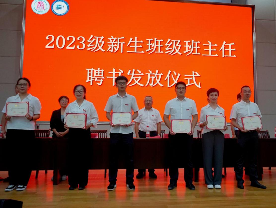 随后举行了2023级班主任聘书颁发仪式。院党委书记兰四清教授宣读了2023级新生班级班主任名单,并对班主任工作提出希望和要求。他指出班主任是学校全员育人的重要组成部分,是大学生健康成长的指导者和引路人,希望2023级6位班主任充分发挥专业老师教书育人的工作优势,在学生思想引领、学业指导、心理健康教育、生活关怀、就业创业指导等方面发挥重要作用,希望班主任启智润心,因材施教,充分施展育人智慧,让每个学生都有人生出彩的机会,在班主任岗位上实现躬耕教坛,强国有我的抱负。与会院领导为梁旭、黄蕾、孙翔、王荣、张煜灿、章磊等6位老师颁发班主任聘书。