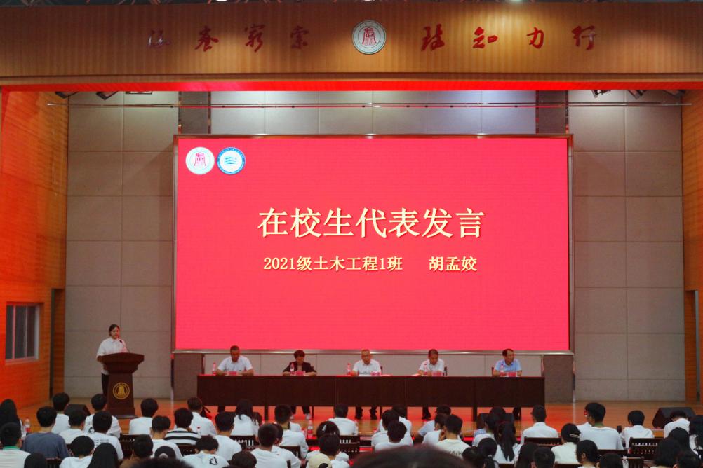 2021级土木工程1班胡孟姣同学代表在校生发言。他结合自己的经历与学弟学妹们分享了3点认识:一是要在担当中实现自我价值;二是要在实干中寻找不断前行的方向;三是要在奋斗中种下顽强成长的种子。