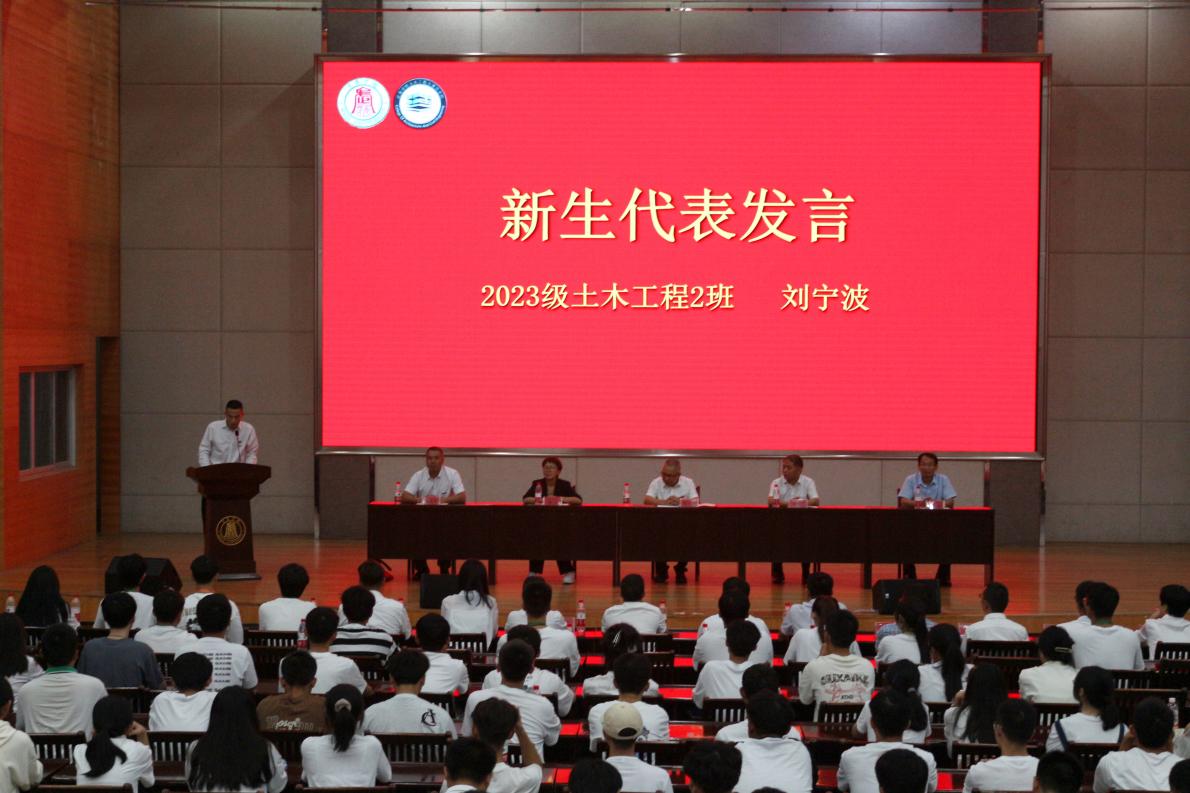 2023级土木工程2班刘宁波同学代表新生发言。他认为新生入学后要快速转变角色,适应生活,要持之以恒地学习,要养成思考的习惯,还要注重实践。