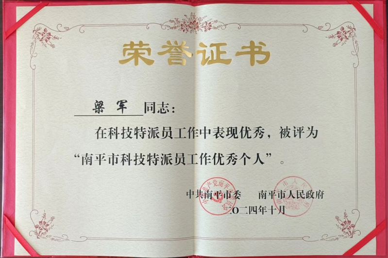 20241021日上午,南平市科学技术大会暨科技特派员工作总结表扬大会在南平大剧院1层大剧场隆重召开。会上,南平市委、市政府表彰了我市科技特派员优秀集体和优秀个人,我院团委书记梁军老师获评南平市科技特派员工作优秀个人”。