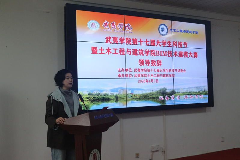 2026年4月2日下午,武夷学院第十七届大学生科技节暨BIM技术建模大赛开幕式在瑞樟7号教学楼101学术报告厅顺利举行。校团委书记王波、院党委书记施晓莉等领导老师出席开幕式,学院各科室负责人、各系系主任、赛事裁判老师及全体参赛选手参加活动。开幕式上,院党委书记施晓莉致辞,她强调BIM技术建模大赛是学院的重要品牌活动,旨在推动学院数字化建设,希望同学们珍惜机会,不断提升专业技能和综合素质。 裁判长谢程乐老师代表全体裁判员庄严宣誓,全体裁判员将恪守规则、秉公执法,以专业素养与责任担当坚守公平、公正、公开原则,全力保障赛事顺利开展,为每一位参赛选手保驾护航。开幕式结束后,大家一同前往BIM实训中心参观了比赛现场。