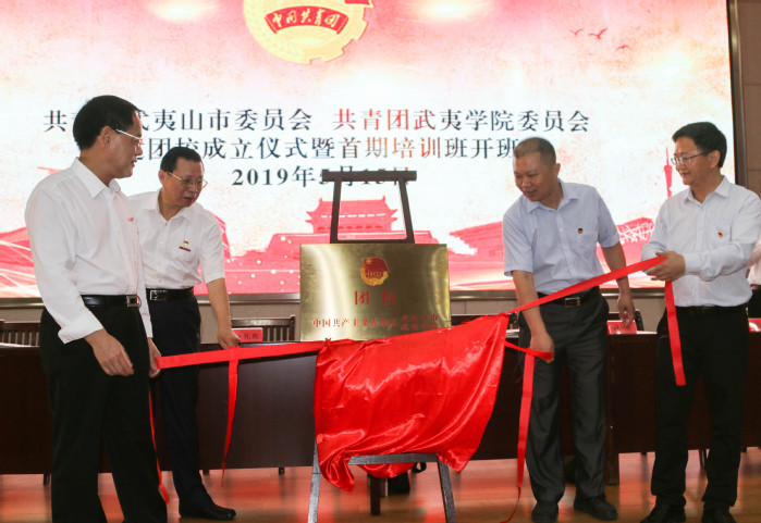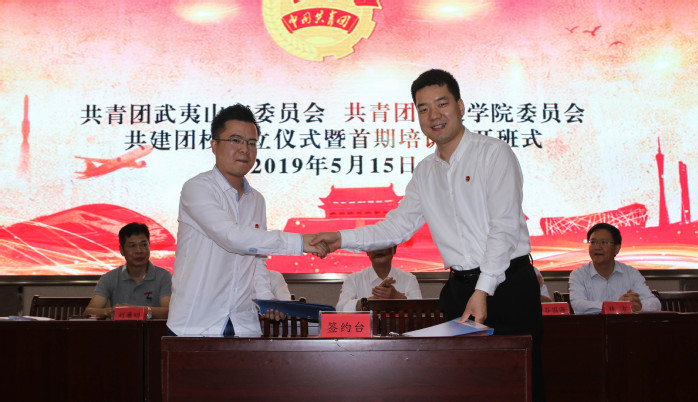 团市委书记周建坤和校团委副书记王波现场签订合作共建备忘。参训学员代表武夷街道团工委书记郑媛媛和我校学生代表李文泽上台发言。与会领导共同为共青团武夷山市团校揭牌。成立仪式结束后,南平团市委书记谷国海为学员们做了专题辅导讲座。