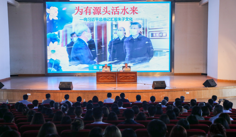4月22日,我校举办学习宣传贯彻落实习近平总书记来闽考察重要讲话精神专题报告会,特邀福建省文史馆馆员、第四届南平市政协主席、南平市老年大学校长张建光莅校作《为有源头活水来——向习近平总书记汇报朱子文化》专题讲座。校领导吴承祯、陈金瑞、杨昇、陈宗荣、张大烛、郑细鸣,南平市关工委常务副主任、南平市政协原副主席郭翠莲,校关工委主任、校党委原副书记姚进生出席了报告会,南平市关工委、校关工委有关领导及我校近1000名师生代表参加了报告会。校党委委员、副校长廖斌主持会议。