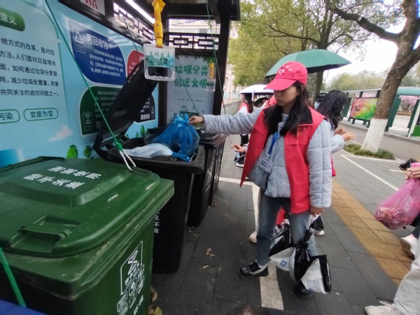 之后,志愿者们的拎着满当当的垃圾环保袋前往垃圾分类点,进行垃圾分类。