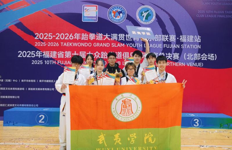 2025–2026年跆拳道大满贯世青俱乐部联赛·福建站的比赛在南平市建阳体育馆举行。我校跆拳道代表队在本次赛事中斩获8金2银2铜,苏子懿同学获评“女子竞技最有价值运动员”,尽显我校学子的体育风采。