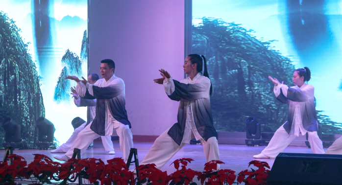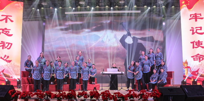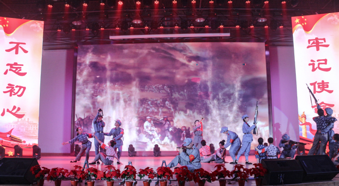 晚会在充满活力与朝气的乐队《黄种人》中拉开帷幕,青春洋溢的歌曲瞬间点燃全场观众的热情。节目涵盖舞蹈、朗诵、武术表演、旗袍秀、音诗画等形式,主旋律突出,高潮迭起,异彩纷呈。舞蹈《天耀中华》以舞步表达了对祖国的挚爱之情;集体朗诵《初心》《读中国》描绘了一幅祖国的江山长卷和壮阔蓝图;武术表演《水墨丹青太极风》刚柔并济、唯美激昂;合唱《十送红军》、舞蹈《映山红》、音诗画《永不褪色的记忆》、歌曲《我和我的祖国》将中华儿女心中对祖国的无限深情表达得淋漓尽致;留学生歌曲《喀秋莎》以歌抒怀,表达了对和平的美好祈愿;旗袍《东方旗袍秀》温婉优雅、美轮美奂。晚会在现场大合唱《歌唱祖国》中落下帷幕,嘹亮的歌声,舞动的红旗,千余名教职工向祖国深情告白,寄托了对伟大祖国深深的热爱之情和生活在新时代的无限自豪。