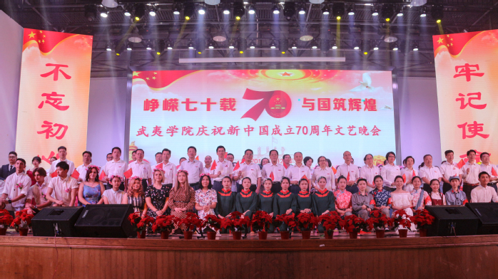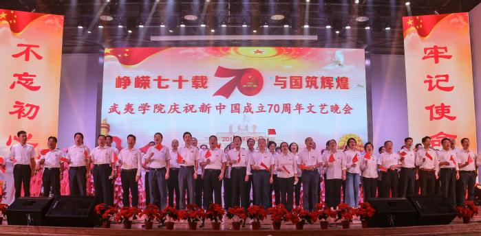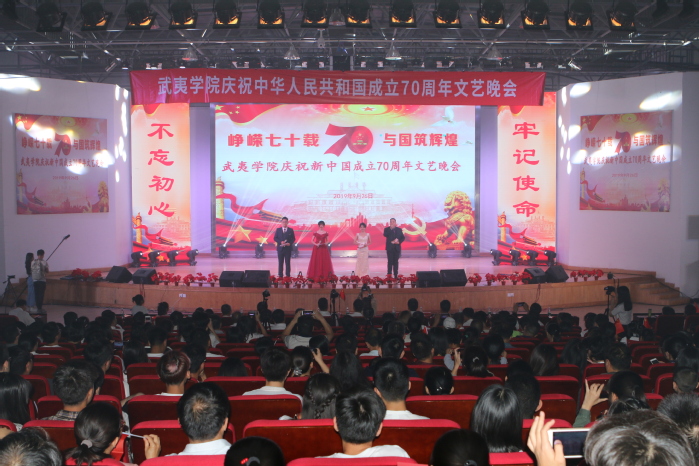 为隆重庆祝新中国成立70周年,表达全校师生对伟大祖国的深深祝福,在全校深入开展“不忘初心、牢记使命”主题教育之际,9月26日晚,由武夷学院主办、武夷学院工会委员会和团委承办、武夷学院学生会协办的 “峥嵘七十载与国筑辉煌”庆祝新中国成立70周年文艺晚会在学生活动中心报告厅隆重举办。校领导肖铮、吴承祯、陈金瑞、杨昇、陈宗荣、张大烛,南平市政协副主席、校董事会常务副董事长郭翠莲与全校教职工一同观看演出。