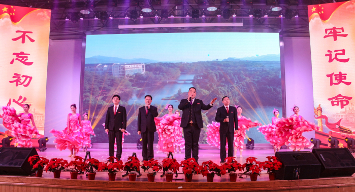 晚会上,校党委书记肖铮代表校党委和行政,向多年以来为把学校建设为特色鲜明的高水平应用型本科院校而不懈奋斗的全校师生员工表示崇高的敬意和衷心的感谢。他指出,在庆祝中华人民共和国成立70周年之际,我们每个人都应当用自己的行动写下对母亲的誓言与忠诚:每一名教职员工都要认真肩负起教书育人、管理育人、服务育人的使命,以培养人才、繁荣学术、发展先进文化和推进社会进步为己任,为培养德智体美劳全面发展的社会主义建设者和接班人辛勤耕耘,努力工作;每一名青年学生都要把自己的理想、事业和追求同共和国的理想、事业和追求紧紧联结在一起,自觉继承和发扬“艰苦创业、奋发有为”学校精神,铭记和践行“涵养穷索、致知力行”校训,积极投身新时代中国特色社会主义事业。他强调,面对新时代高校发展的新形势、新任务、新要求,要坚定理想信念,牢记初心使命,振奋精神,扎实工作,以强烈的使命感、责任感落实好为党育人、为国育才、立德树人根本任务,奋力推进学校高质量发展,为实现“两个一百年”奋斗目标和中华民族伟大复兴的“中国梦”做出新的更大贡献。