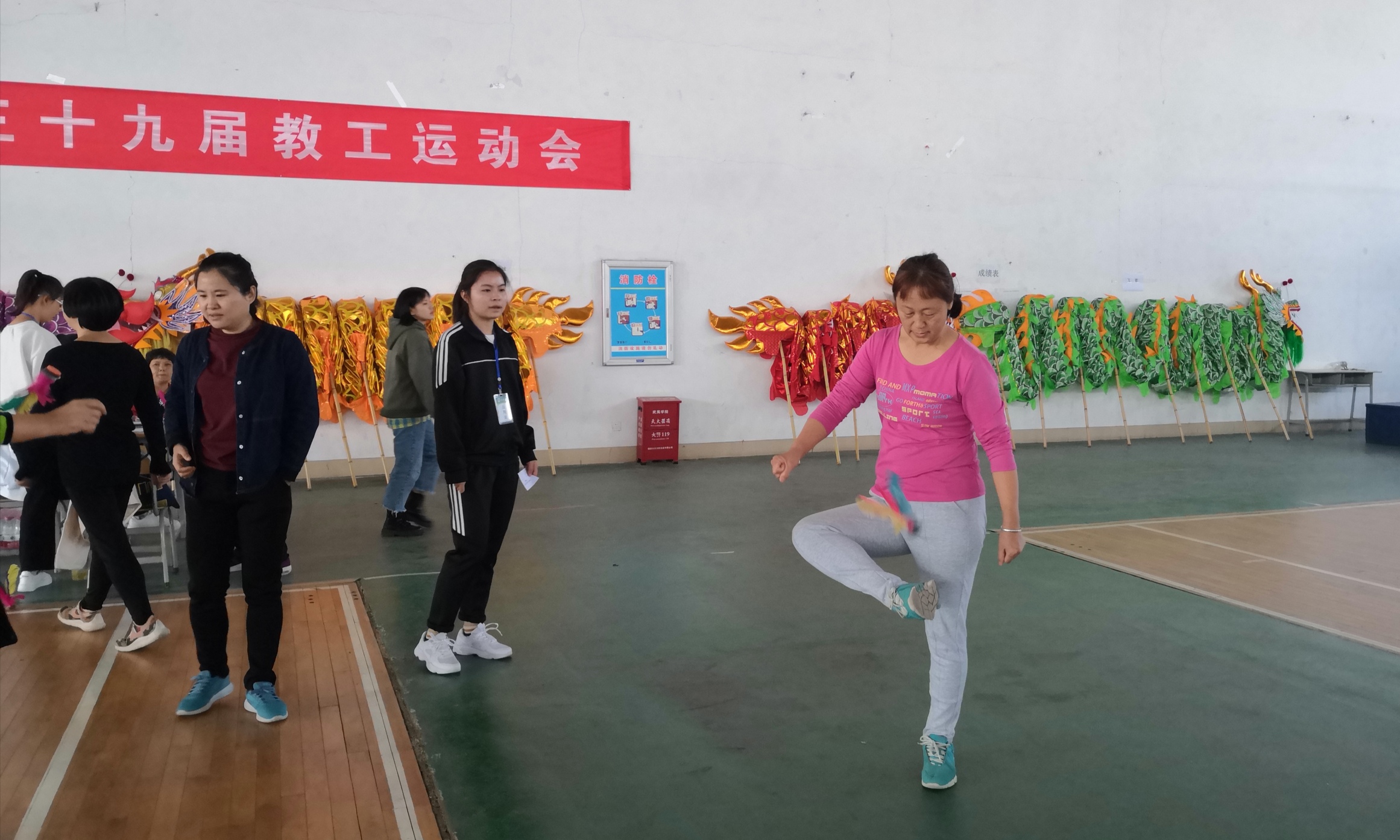 比赛场上,每一位教职工笑容满面,精力充沛,朝气蓬勃。比赛设集体项目“4•100米接力赛”、“龙卷风”、“春播秋收”,设个人项目“网球击准”、“一分钟跳绳”、“男女子100米”等。在比赛过程中教职工们个个全力投入力争第一,赛出了个人的风采,赛出了学校集体的凝聚力。;加油声、呐喊声、欢声笑语此起彼伏,处处洋溢着团结和谐、奋勇拼搏的良好氛围,通过这次运动会,我们看到了平日里站在讲台前的老师们的另一面风采。胜利时,他们也会如孩子般在场上欢呼雀跃,在赛场上尽情挥洒着激情,释放着激情。欢声笑语中,运动会圆满结束。