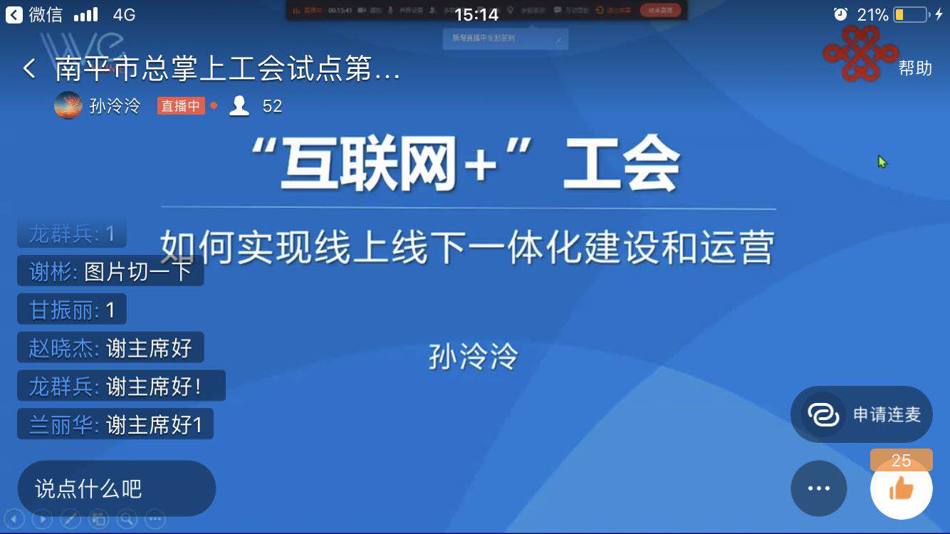 会议首先由南平市总工会副主席谢彬简要说明本次培训视频会的背景和目的,表示“掌上工会”具备较强的实用性、活跃性和创新性,能有效提高广大会员归属感、获得感和幸福感,亦是各级分工会小组联系会员、服务会员的智慧助手,希望通过本次的培训,能进一步推动“掌上工会”平台的运营。