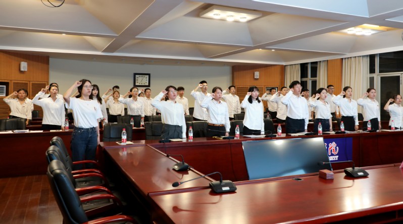 接着,在领誓人甘振丽的带领下,新进教职工面对会徽宣读誓词,进行了庄严的宣誓仪式。