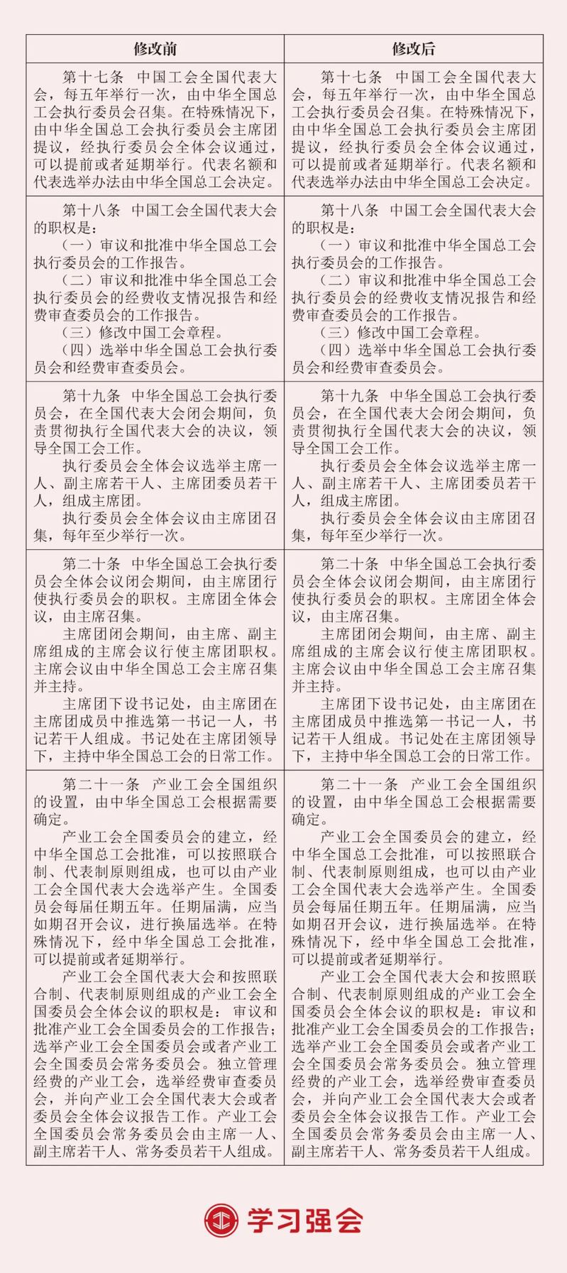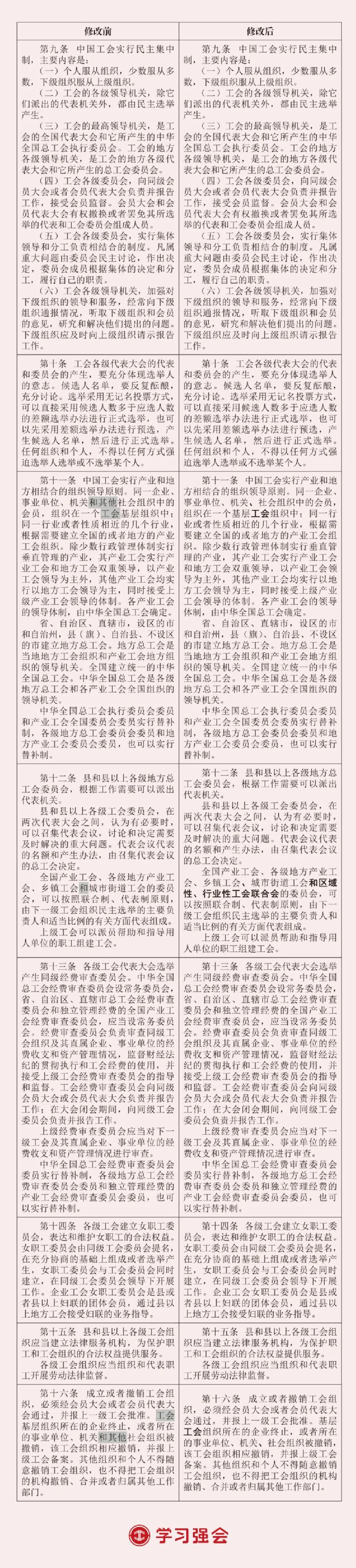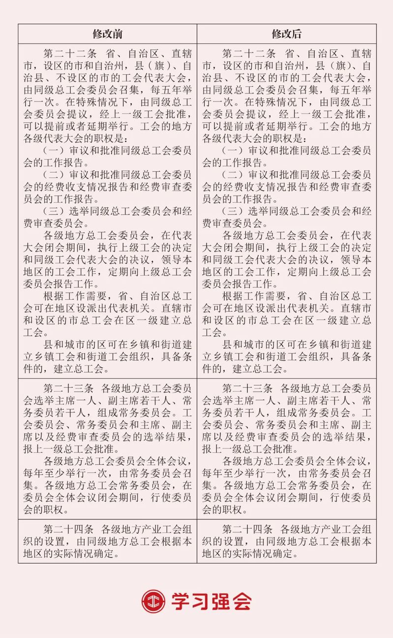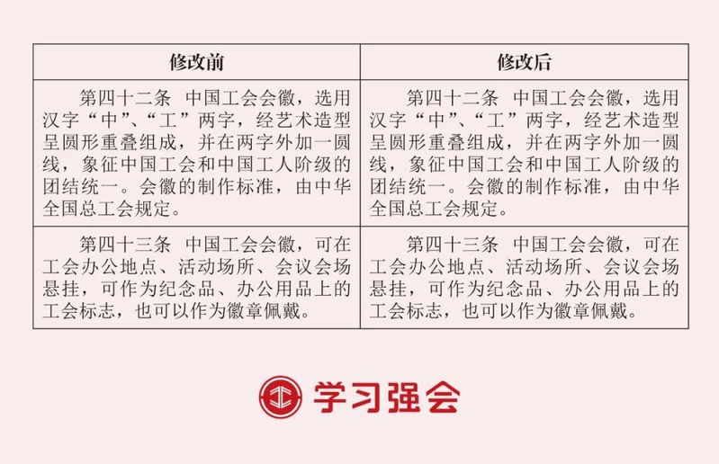 中国工会第十八次全国代表大会通过了《中国工会章程(修正案)》。此次修改主要在总则中增写深刻领悟“两个确立”的决定性意义、深入学习贯彻习近平总书记关于党的建设的重要思想、为实现新时代新征程党的中心任务而奋斗、发展全过程人民民主、推动产业工人队伍建设改革等内容,以及在有关条文中明确新就业形态劳动者入会权利,明确区域性、行业性工会联合会组织形式,规范基层工会委员会名称和任期,明确工会干部能力本领要求等。为方便广大工会干部对照学懂弄通修改内容、指引工作实践,“学习强会”整理推出2023年《中国工会章程》修改前后对照表。