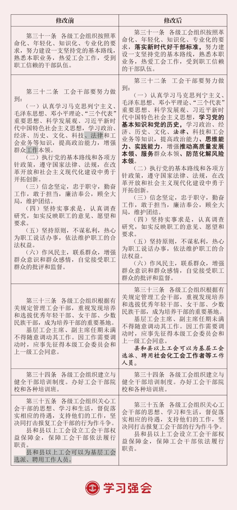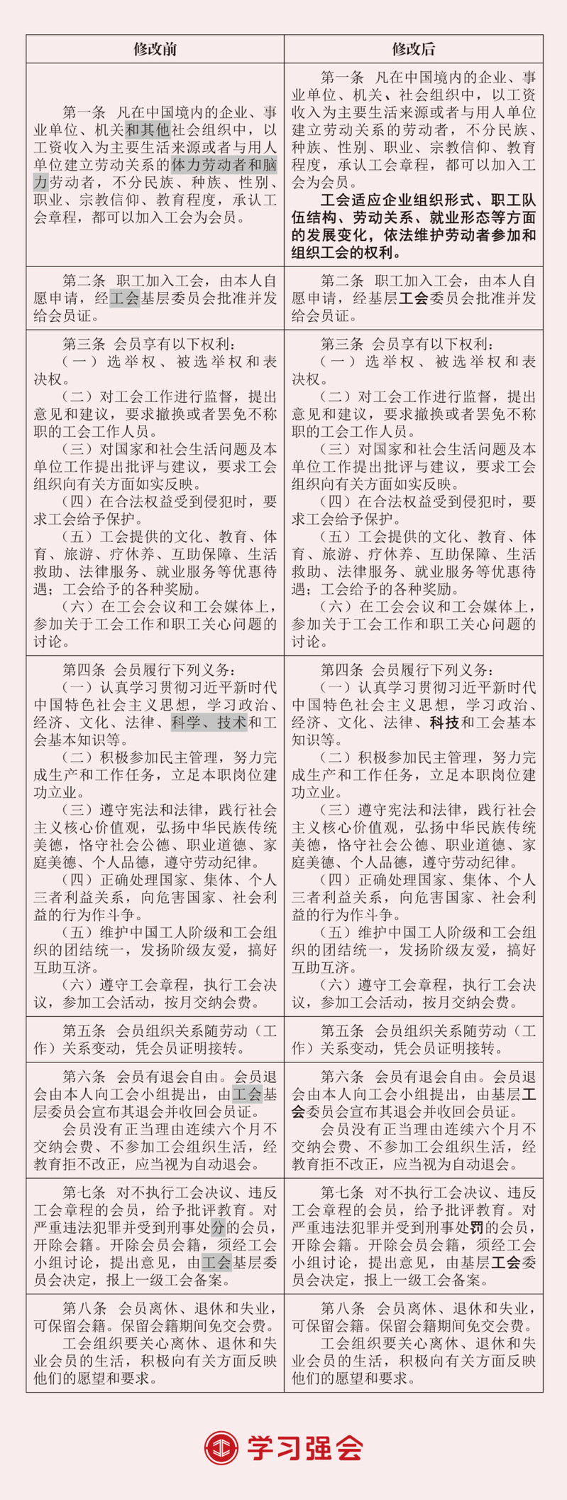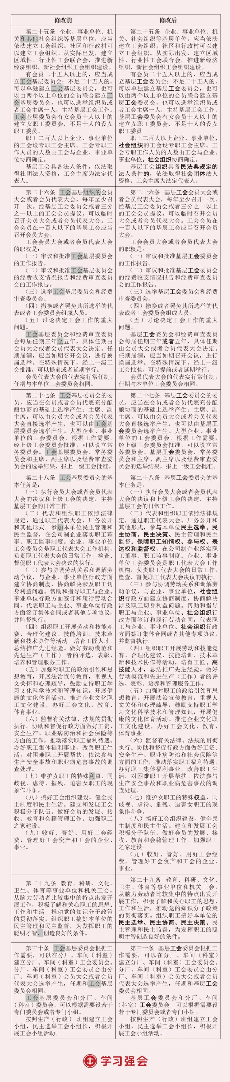 中国工会第十八次全国代表大会通过了《中国工会章程(修正案)》。此次修改主要在总则中增写深刻领悟“两个确立”的决定性意义、深入学习贯彻习近平总书记关于党的建设的重要思想、为实现新时代新征程党的中心任务而奋斗、发展全过程人民民主、推动产业工人队伍建设改革等内容,以及在有关条文中明确新就业形态劳动者入会权利,明确区域性、行业性工会联合会组织形式,规范基层工会委员会名称和任期,明确工会干部能力本领要求等。为方便广大工会干部对照学懂弄通修改内容、指引工作实践,“学习强会”整理推出2023年《中国工会章程》修改前后对照表。