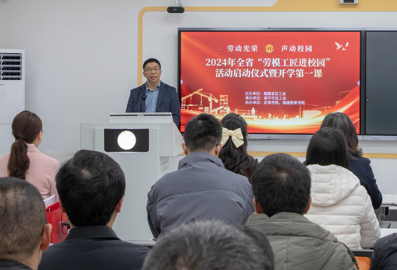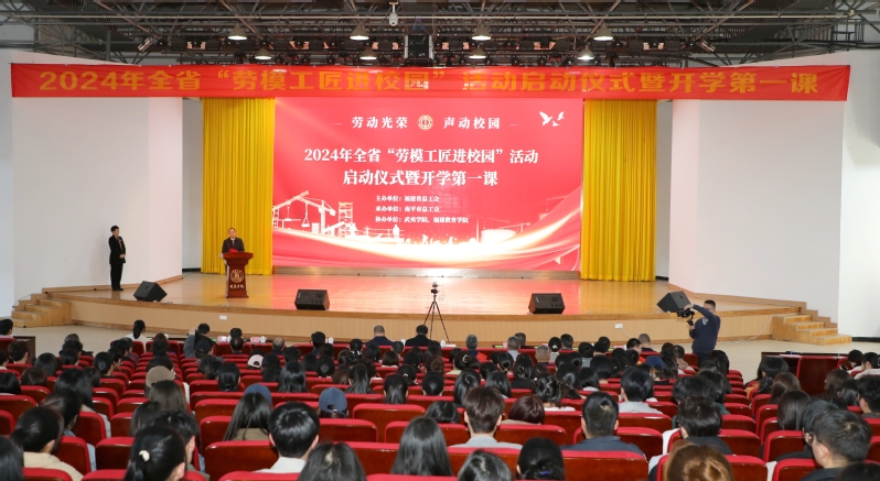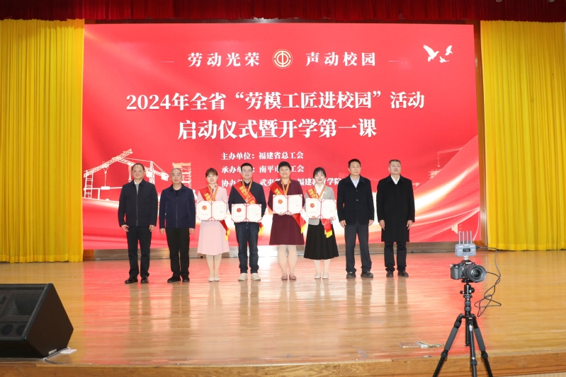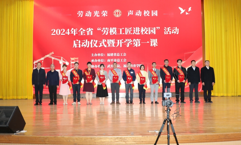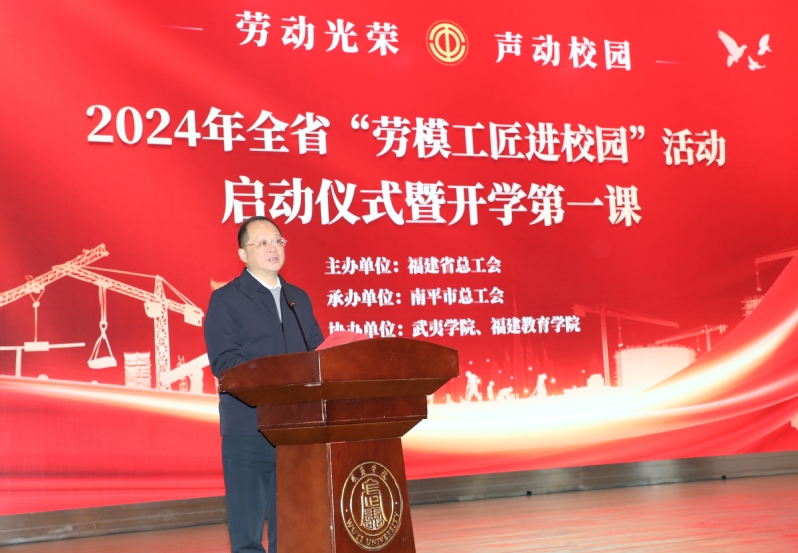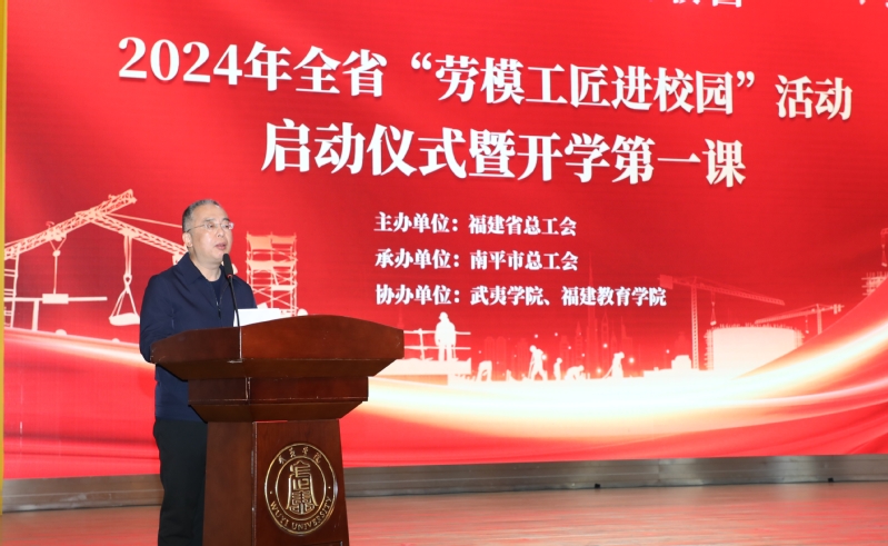 3月7日下午,由福建省总工会主办,南平市总工会承办,武夷学院、福建教育学院协办的“劳动光荣,声动校园——劳模工匠公开课”活动启动仪式在我校举行。福建省教科文卫体工会工作委员会主任郭立新,福建教育学院党委委员、副院长张志刚,武夷学院党委副书记、工会主席梁方,南平市总工会党组书记、常务副主席朱金生出席活动。
