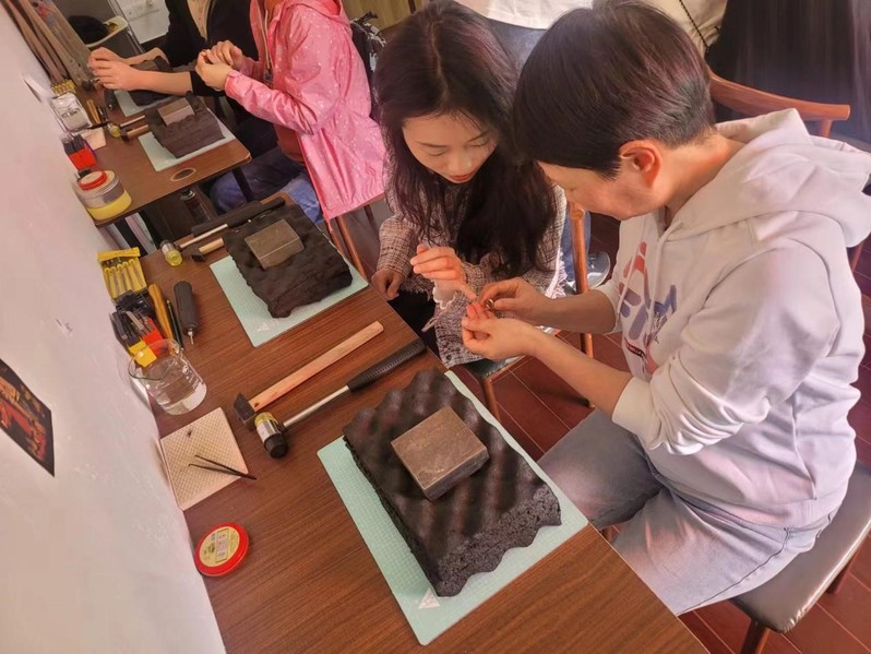 首先,工作人员带领大家参观了手工制作坊,使大家初步了解了银器手工制作的流程。然后,银器制作师傅给大家讲解了银器及其手工制作知识。最后,在银器制作师傅的指导下,大家开始手工制作银器体验。