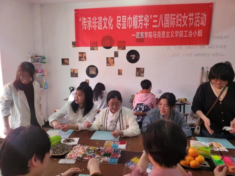为了庆祝第114个国际“三八”妇女节,丰富女教工业余文化生活、传承非遗文化、展现女性风采,马克思主义学院工会小组于3月30日下午,利用周末时间组织全体女教工在武夷山市快乐星球·DIY手工坊开展传承非遗文化·尽展巾帼芳华——银制品手工制作体验活动。