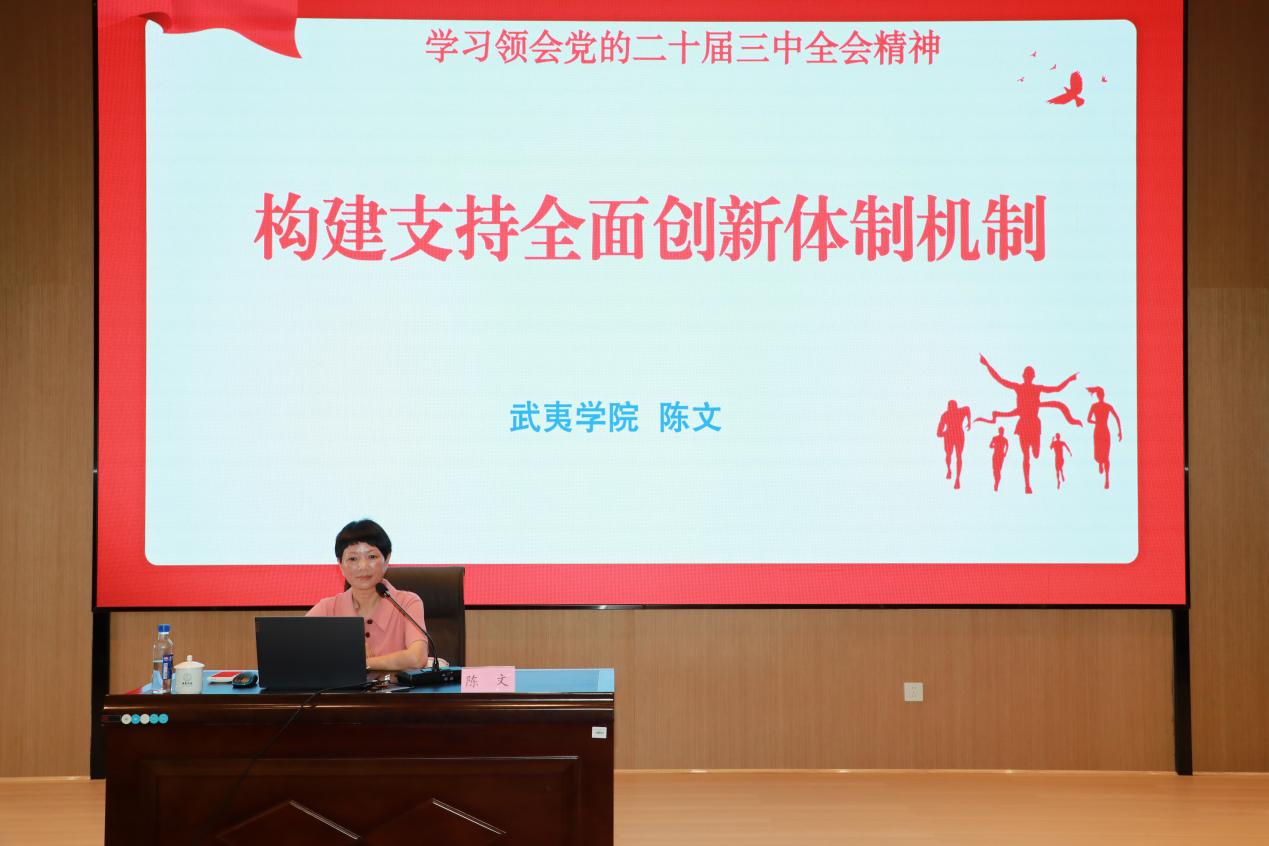 我院马克思主义学院副院长陈文教授以《学习党的二十届三中全会精神 构建支持全面创新体制机制》为与会人员做了“闽北讲习班·姐妹好声音”高校首场示范宣讲。