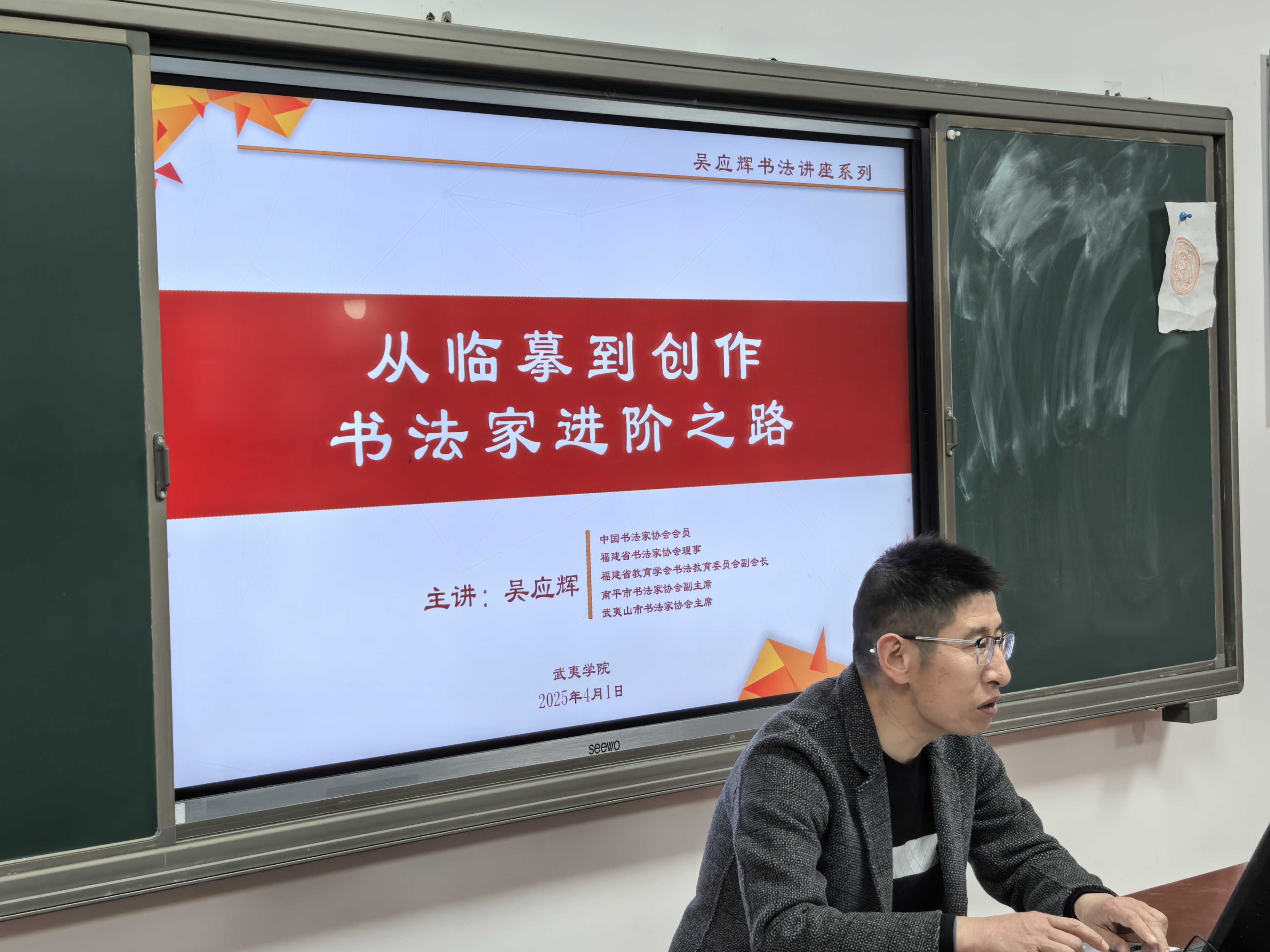 4月1日晚19:00,我校书法协会在同文4-203书法智慧教师举办了“从临摹到创作——书法家的进阶之路”专题讲座,特邀中国书法家协会会员、南平市书法家协会副主席、武夷山市书法家协会主席吴应辉老师担任主讲,吸引了50余名师生到场参与。