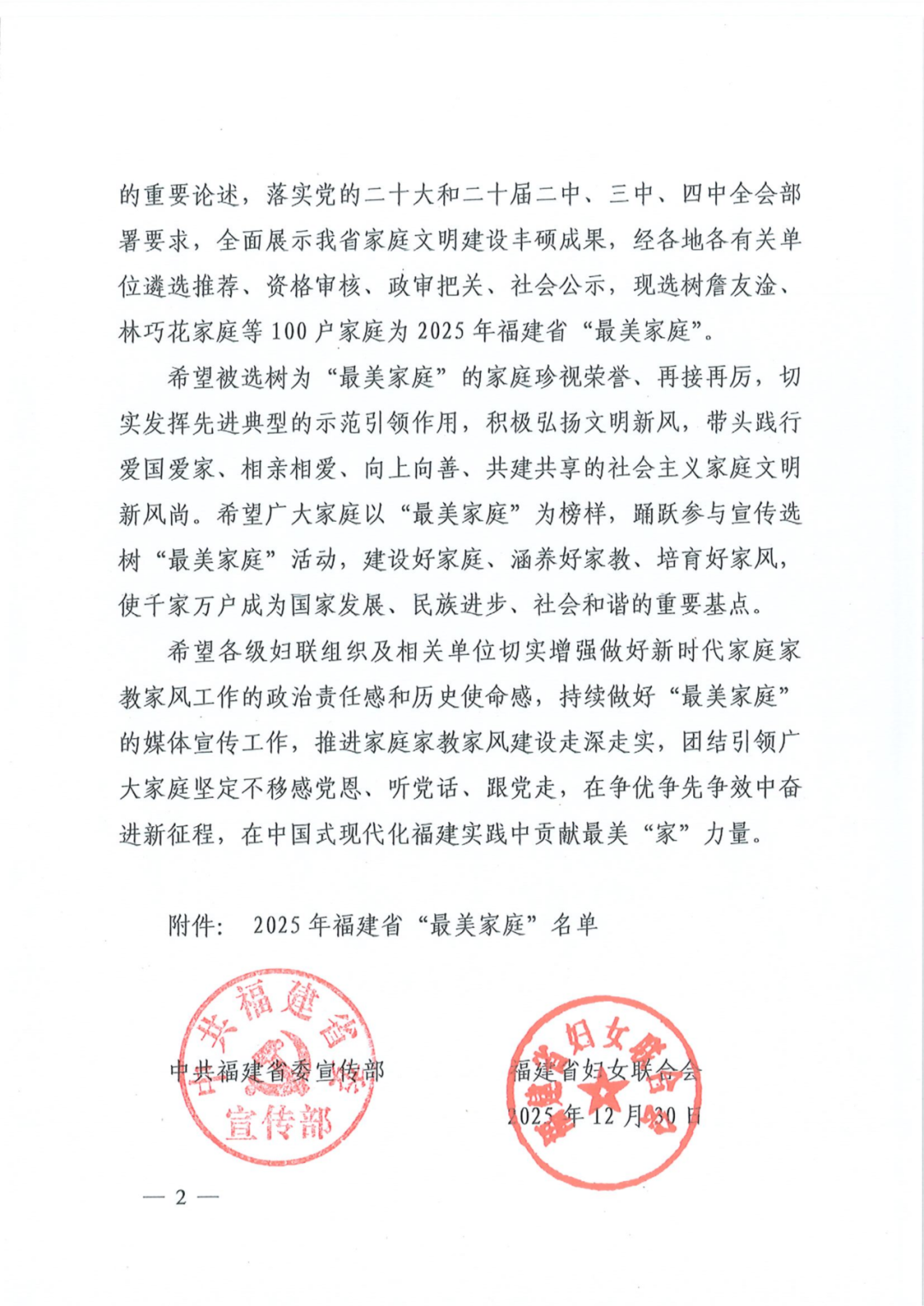 近日,中共福建省委宣传部、福建省妇女联合会联合公布了2025年福建省“最美家庭”名单,我校台湾教师黄柏翰、黄周宝玲老师家庭光荣上榜,荣获福建省“最美家庭”称号,成为弘扬优良家风、促进两岸融合的生动典范。这一荣誉不仅是对黄柏翰、黄周宝玲家庭优良家风的高度认可,也是我校持续深化家庭文明建设、弘扬社会主义家庭文明新风尚的生动体现。