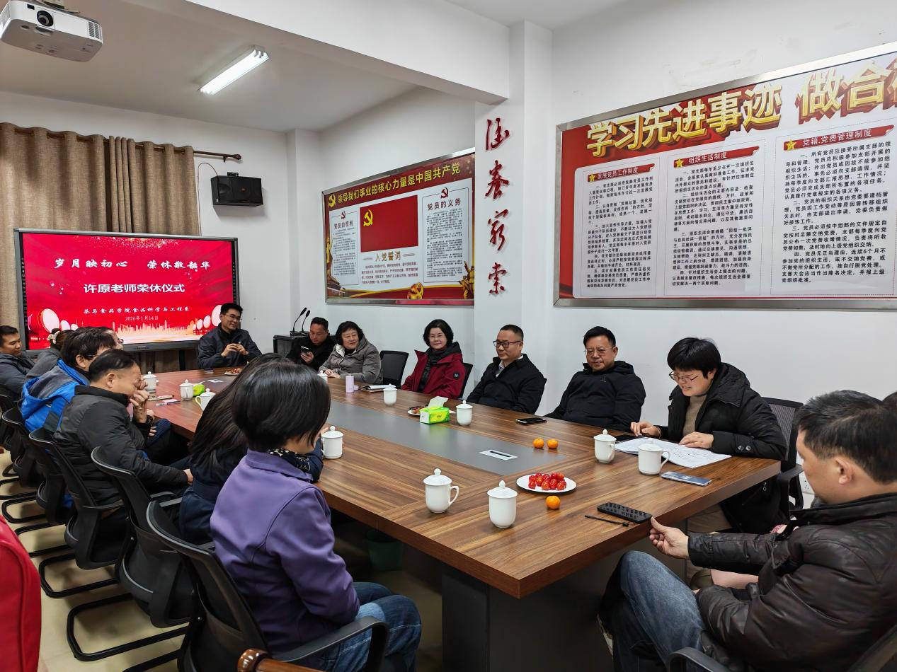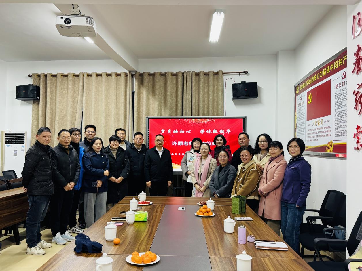 2026年1月14日,茶与食品学院分工会为许原老师举行荣休座谈会。学院领导及各系主任、食品科学与工程系全体教师齐聚一堂,共同回顾许原老师的教育生涯,表达深深敬意与美好祝愿。座谈会由院党委书记、分工会主席施晓莉同志主持。