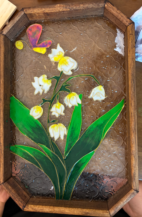 活动现场,全体女教工在负责老师的悉心指导下,热情高涨地投入到茶盘制作中。大家首先根据自己的喜好挑选图案,随后手持工具,小心翼翼地茶盘上粘好金丝。接着,大家充分发挥创意,调配颜料为作品增添绚丽的色彩。最后,等待作品干燥定型,让一个个茶盘摇身一变,成为了赏心悦目的花朵DIY作品。