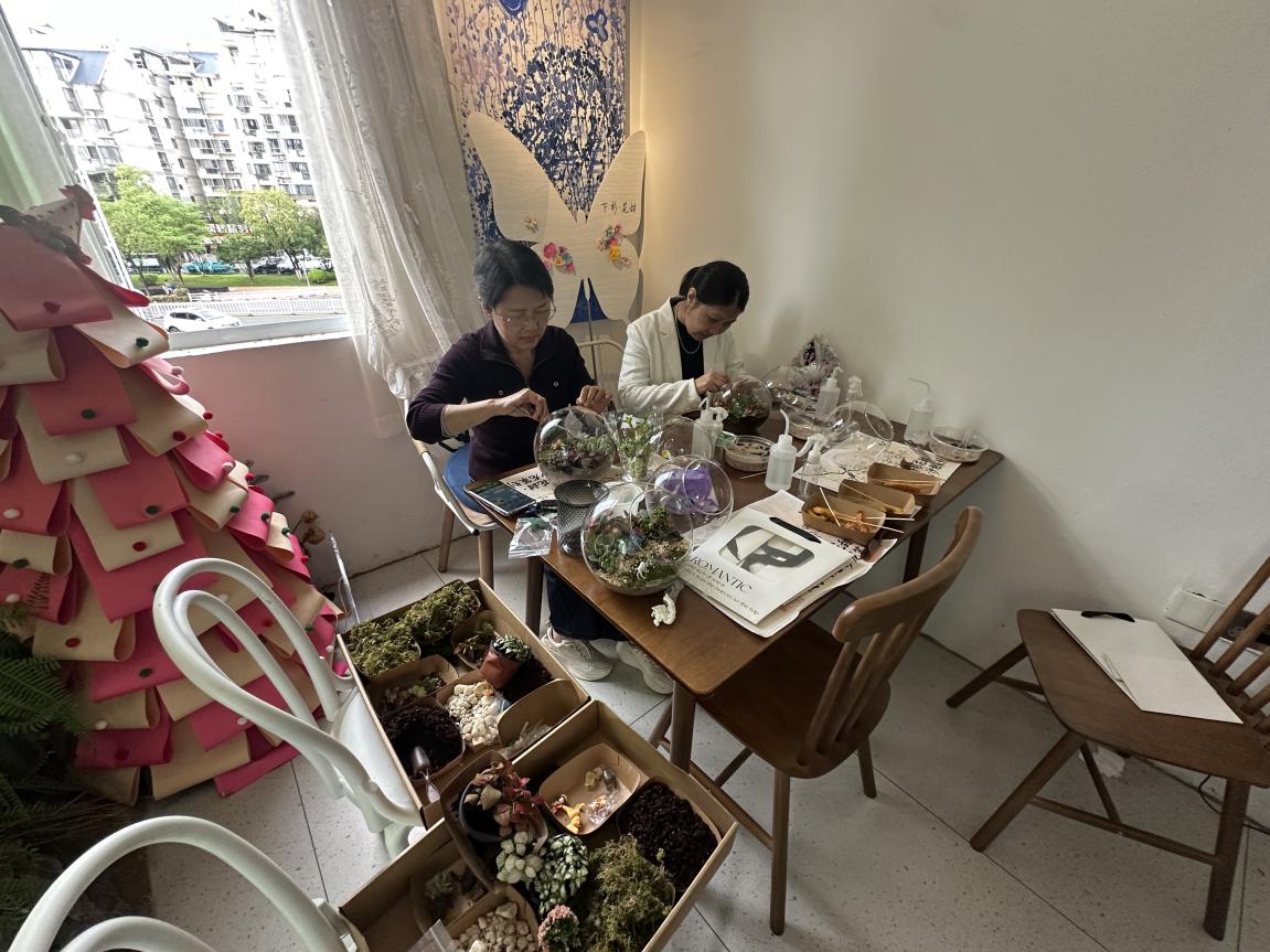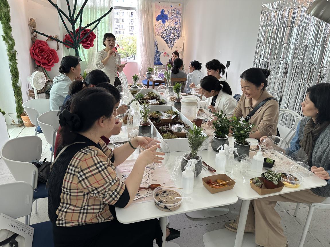 在动手创作环节,女同胞们精心挑选心仪的绿植,经过填土、栽种、布局、装饰,将一株株小巧可爱的绿植组合成错落有致、清新别致的微型盆景。大家相互交流心得、分享创意,指尖流转间,一盆盆独具匠心的盆景新鲜出炉,既有自然野趣,又饱含巧思。现场欢声笑语不断,书香与绿意交织,尽显女性温婉灵动的风采。