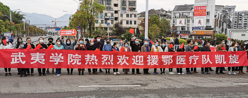 当载着23名英雄的车队途经我校正门时,教职工们手举“武夷学院热烈欢迎援鄂医疗队凯旋”“白衣天使战疫魔、武夷儿女展风采”等横幅,挥舞着国旗热情高呼“英雄凯旋、欢迎回家”,向逆行者英雄们表达心中的敬意。