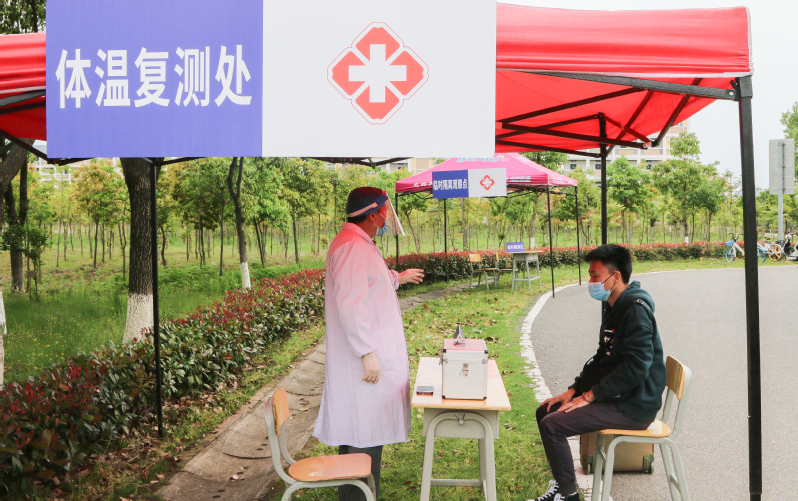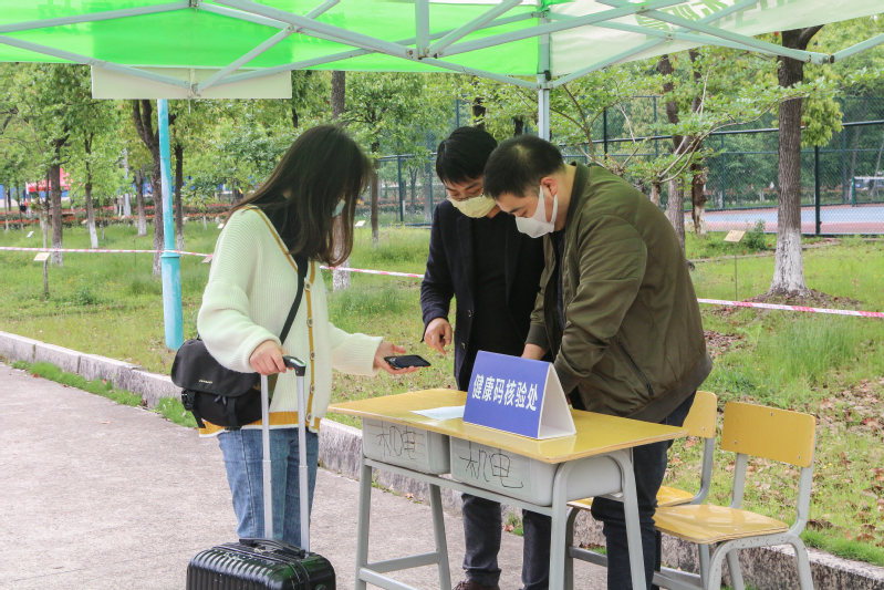随着“演练开始”一声指令,“学生”有序排队分别经过体温测量处、身份核验处、健康码核验处、行李箱消毒处,并按照划定路线返回宿舍楼。演练现场分别设置返校报到现场出现体温异常的学生、在报到现场身份核验区出现未带证件的学生、健康码为“黄码”的返校学生、乘坐私家车返校学生等四个场景,模拟了学生返校入校身份验证、健康检测以及突发情况应急处置等情况。