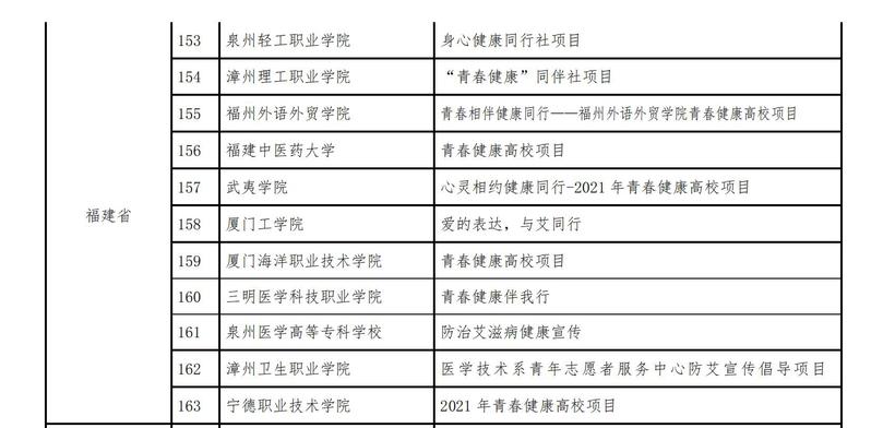 日前,中国计划生育协会发布《关于2021年青春健康高校项目招标中标结果的通知》(国计生协〔2021〕19号),我校“心灵相约,健康同行”健康教育项目成功入选2021年青春健康高校项目,喜获福建省计生协专项资金立项资助。