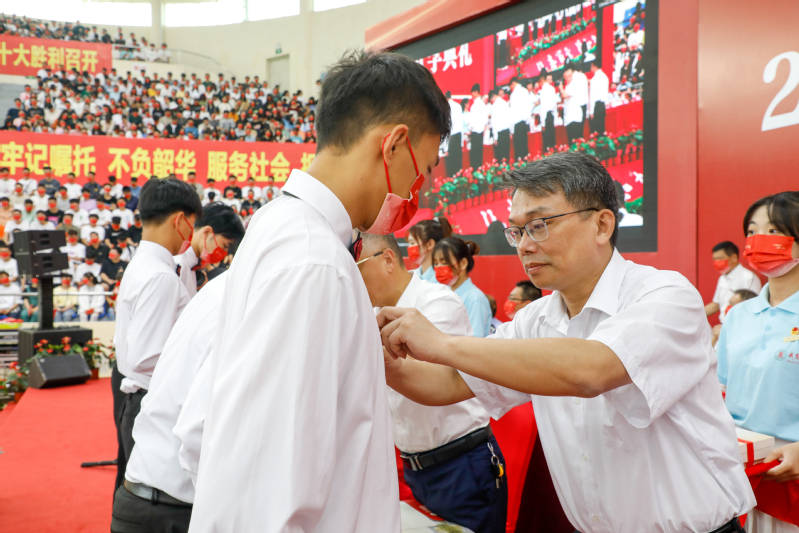 在6名优秀在校生代表的领誓下,全体新生发出“强国有我,请党放心”的铿锵誓言。