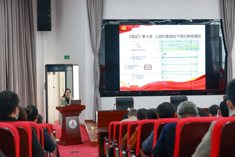 校纪委纪检监察室杨媛同志对《规定》作了解读,她从《规定》制定的背景意义、主要内容以及中央对各级党委、纪检监察机关的工作要求等方面,结合我校实际,对党的各级各类组织处分违纪党员批准权限和程序进行了详细阐述。