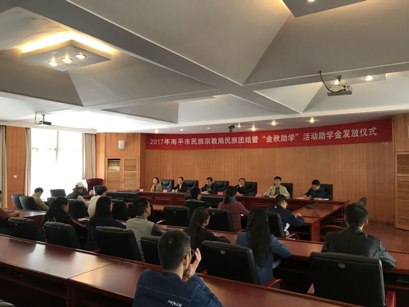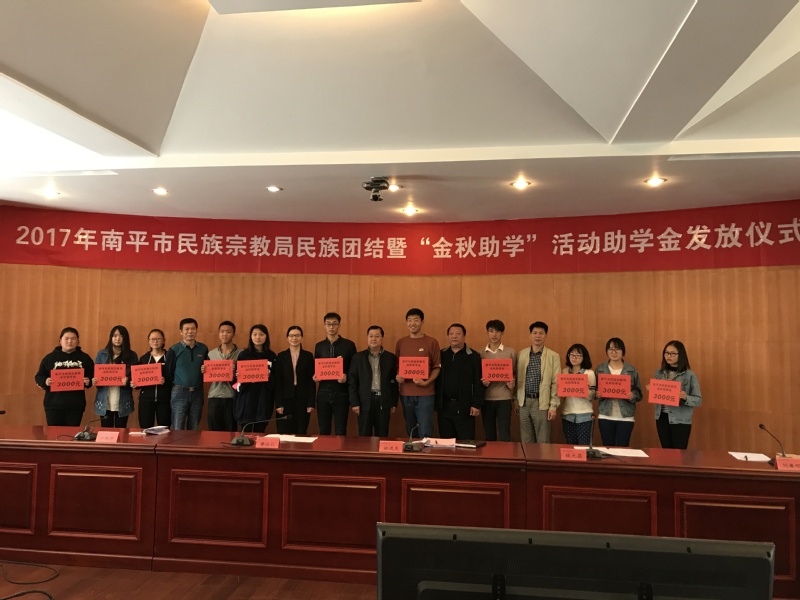 10月24日,我校举行2017年南平市民族宗教局民族团结暨“金秋助学”活动助学金发放仪式。南平市民族与宗教事务局局长廖汉仁、副局长钟艳华,校党委副书记姚进生、统战部部长林元昌、学生处副处长刘廉明,各二级学院学工科负责人及受助的少数民族贫困生参加活动。发放仪式由林元昌部长主持。