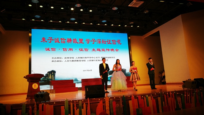 为进一步在我校宣传学诚信、讲诚信、守诚信、促诚信的教育理念,推动大学生德育、智育的双向发展。66日晚,由我校联合人民银行南宁中心支行和南平市金融学会主办,人文教师教育学院、人民银行武夷山支行承办的朱子诚信耕故里,学子深耘征信花主题征信晚会在我校大学生活中心举行。姚进生副书记及我校相关部门,人民银行南平中心支行、南平市金融学会及人民银行武夷山支行的相关部门领导出席本次晚会。
